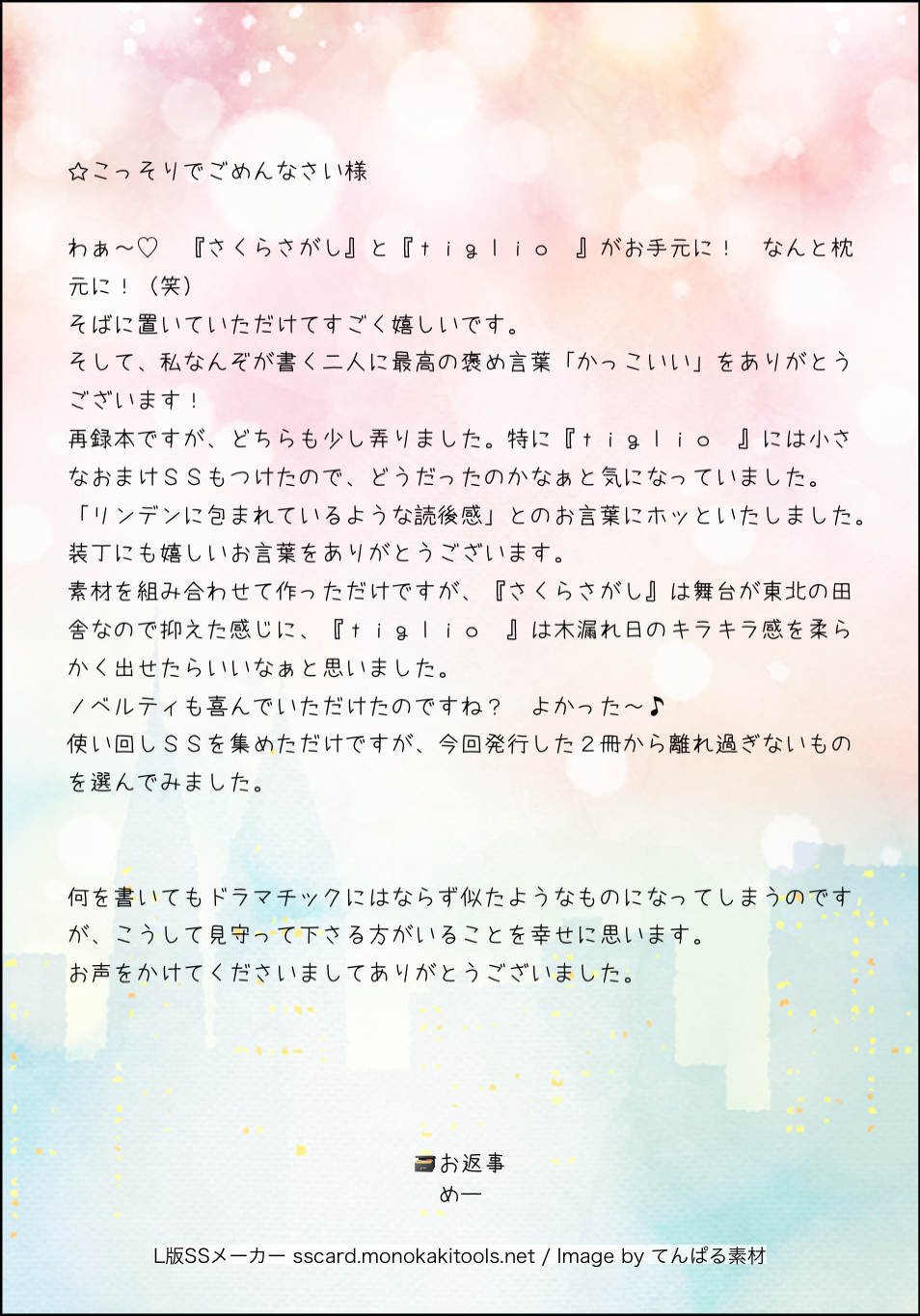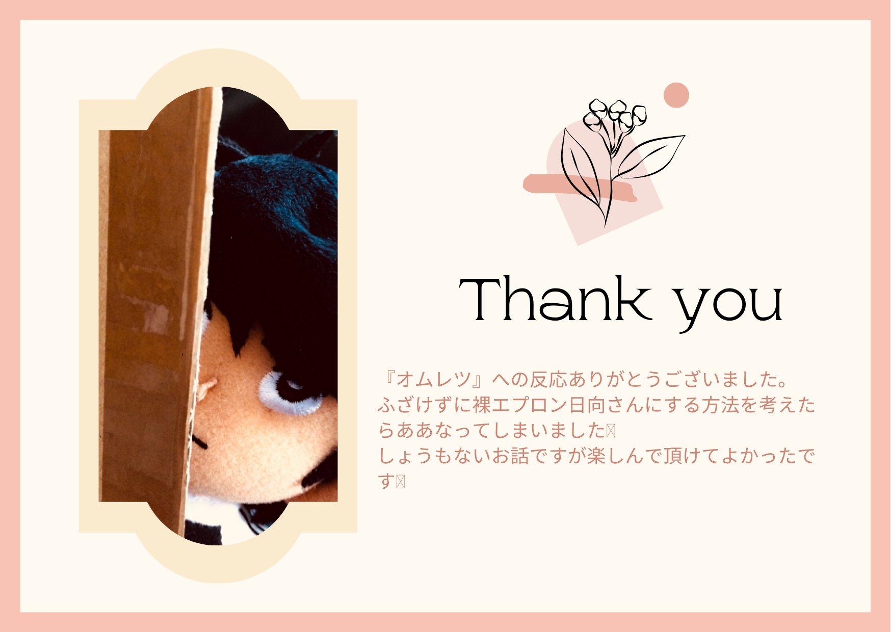 Wavebox お返事 拍手お返事 2022年05月14日 なくさないようにここにもペタリさせてください。頂戴したメッセージはここには貼りませんので〜 ☆新刊の感想をお聞かせ下さいましたこっそりさんへ☆朝の挨拶へのお返事☆『オムレツ』にお言葉を下さいました方へ [1回]